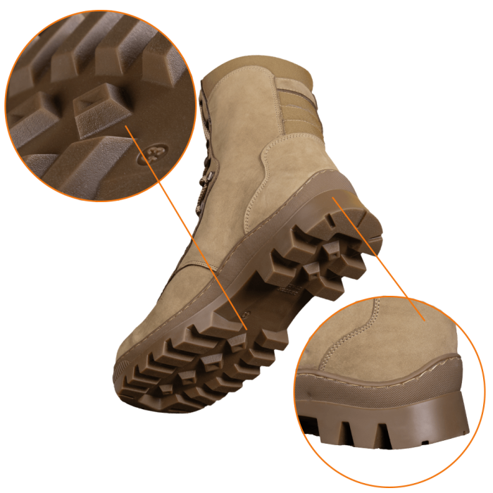 Підошва вироблена з термопластичної гуми. Матеріал стійкий до морозів, а також до хімічних речовин. Підошва має глибокий, агресивний протектор, що збільшує зчеплення з поверхнею. Кріпиться до основи вакуумно-клейовим методом, та прошита якісною, посиленою ниткою. Додатково взуття покрите вологостійким просоченням, що захищає виріб від вологи, пилу та бруду.