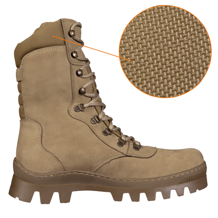 Основа берців вироблена з нубуку. Матеріал виготовлено з натуральної шкіри. Це міцний, щільний, та зносостійкий матеріал, але водночас він м'який, і приємний на дотик. Матеріал оброблено гідрофобним просоченням, яке захищає від вологи, пилу та бруду. Утеплювач вироблено зі штучного хутра. М'який, приємний на дотик матеріал, який ефективно зберігає тепло. Хутро пришито також по низу колодки, замість устілки. Вставки з тканинні в язичкові та на задній частині черевика, які полегшують черевики та додають комфорту при носінні. Добре пропускає повітря і не дає нозі запріти.