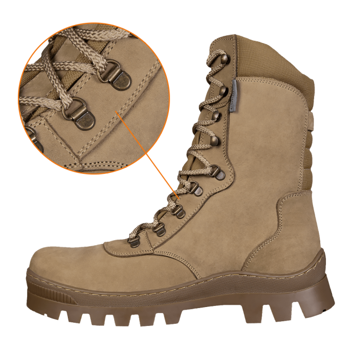 Берці мають сучасний, ергономічний дизайн в мілітарі стилі та високу посадку, завдяки чому надійно фіксуються на нозі. Язичок прошитий до верху, що запобігає потраплянню в середину вологи та бруду. Також замість люверсів встановлені металеві петлі, а замість верхніх люверсів - гачки, для більш зручного та швидкого шнурування. Підошва в районі носка та п’ятки завищена, для кращого захисту.