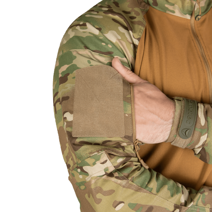 На рукавах в зоні ліктів є місце під налокітники. Вони вставляються зверху, таким чином, щоб при пересуванні повзком, в отвори не забивався бруд. Манжети регулюються та фіксуються на липучки. По боках є кишені з застібками-блискавками, без клапанів (щоб уникнути зачеплення за гілки та кущі). На всіх застібках є пулери, для роботи з ними в рукавичках. Над кишенями є липучки під патчі або шеврони.