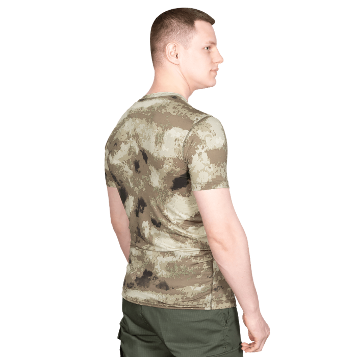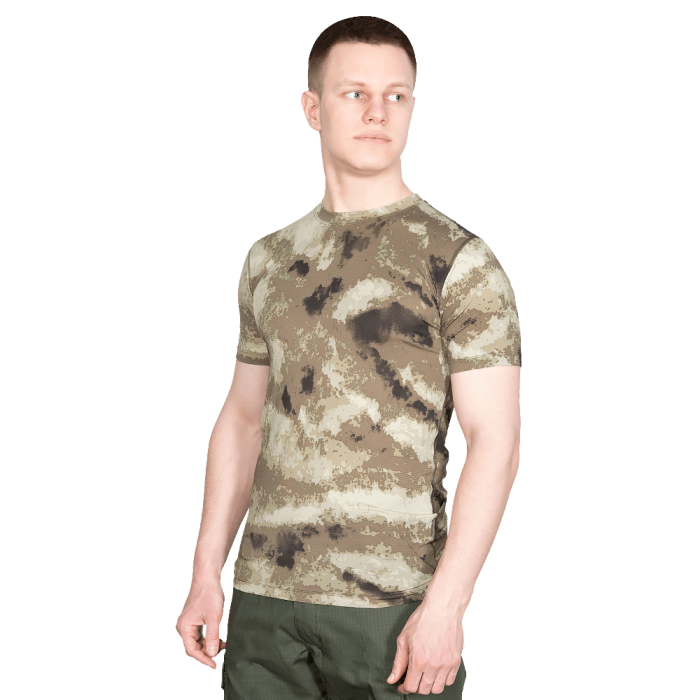 Дихаюча, еластична футболка, яка щільно прилягає, має плоскі шви та майже не відчувається на тілі. Розрахована для охоронних та воєнізованих структур в теплу, спекотну погоду. Футболка також використовується як перший, базовий шар в системі пошарового одягання.  Футболка вироблена з гіпоалергенної тканини CoolTouch, це високотехнологічне, поліестерове волокно, яке завдяки своїй спеціальній структурі ефективно відводить вологу з поверхні шкіри й випаровує її зовні, захищаючи організм від перегріву і залишаючи шкіру сухою. Матеріал створює капілярно-ґнотовий ефект шляхом розподілу вологи по тканині й збільшенням площі для більш ефективного випаровування. Тканина має високі дихаючі, еластичні властивості, а також швидко сохне. Футболка зшита еластичною ниткою за технологією плоских швів, не сковує рухів, не натирає при тривалій експлуатації. Має сучасний ергономічний дизайн, щільно прилягає та майже не відчувається на тілі.  Тканина: CoolTouch  Склад: 100% Поліестер Температурний режим: від 18°C до 30°C