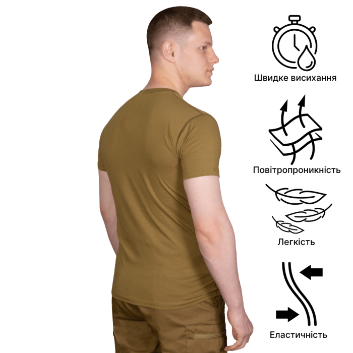 Футболка зшита надійною, еластичною ниткою, за технологією плоских швів. Має зручний, сучасний дизайн та щільно прилягає до тіла, не сковуючи при цьому рухів та не викликає подразнень при тривалій експлуатації.