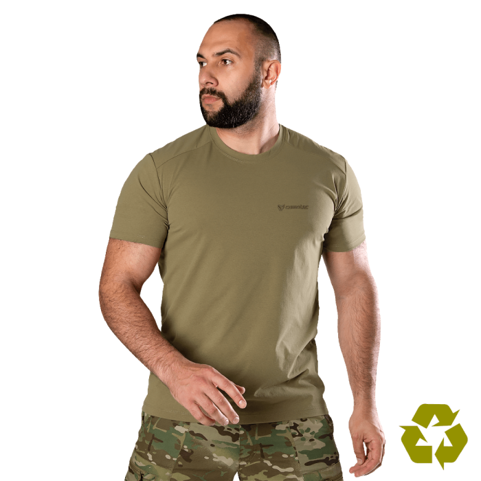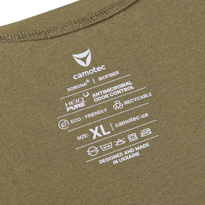Футболка вироблена з тканини Sorona® - це новий стандарт інновацій серед технологічних тканин. Основа тканини - активні целюлозні волокна рослинного походження, тобто виготовлені з природних матеріалів. Вони мають природну структуру, що ефективно керує швидким транспортуванням вологи від тіла, це зберігає ваше тіло приємно прохолодним та сухим при фізичній активності.