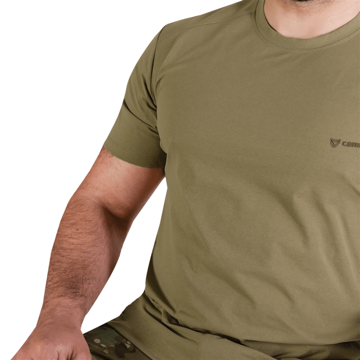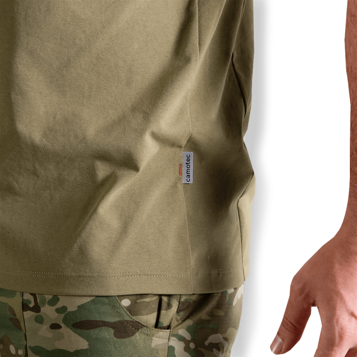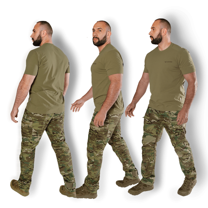 Плечові шви винесені вперед, що запобігає натиранню та подразненню шкіри. По боках футболки передбачені конструктивні вставки, що забезпечують ергономічне прилягання футболки до тулуба.