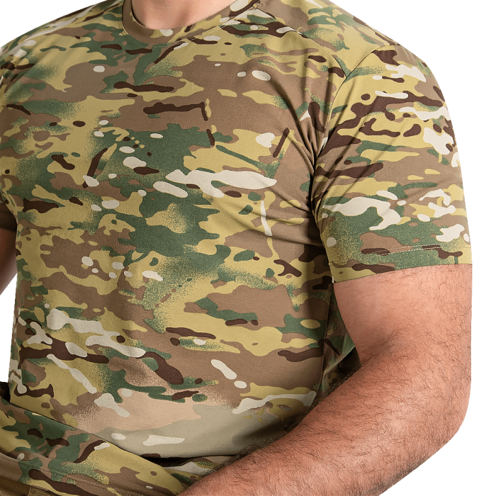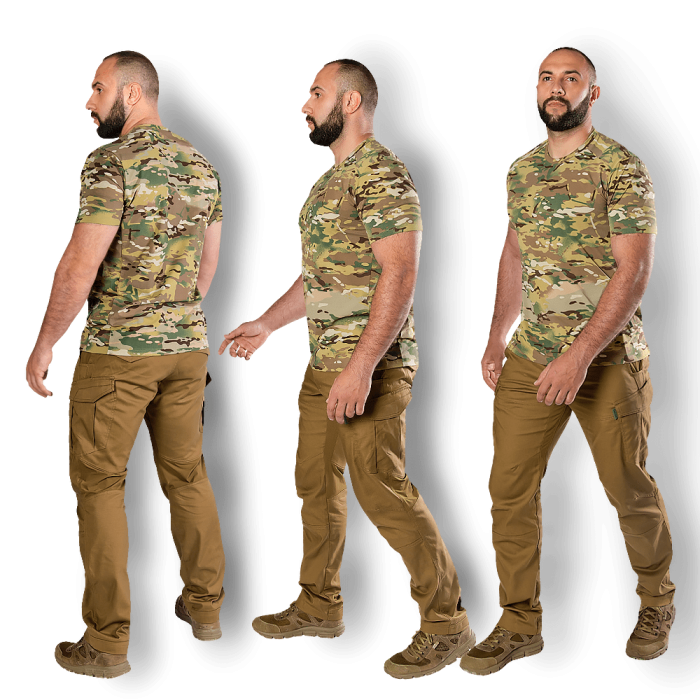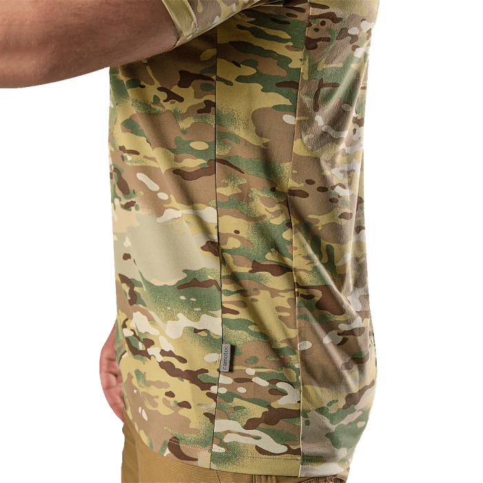 Плечові шви винесені вперед, що запобігає натиранню та подразненню шкіри. По боках футболки передбачені конструктивні вставки, що забезпечують ергономічне прилягання футболки до тулуба.