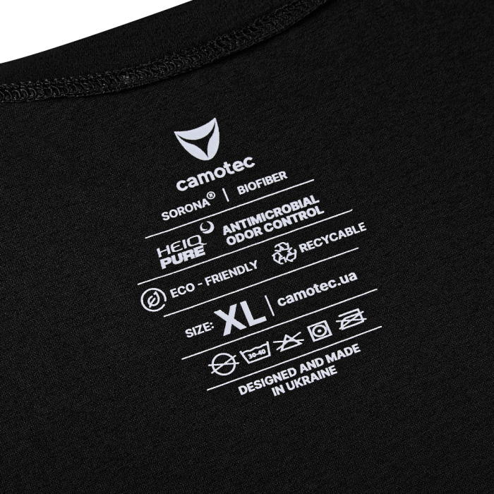 Футболка вироблена з тканини Sorona® - це новий стандарт інновацій серед технологічних тканин. Основа тканини - активні целюлозні волокна рослинного походження, тобто виготовлені з природних матеріалів. Вони мають природну структуру, що ефективно керує швидким транспортуванням вологи від тіла, це зберігає ваше тіло приємно прохолодним та сухим при фізичній активності.
