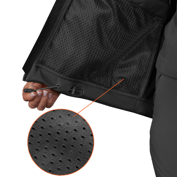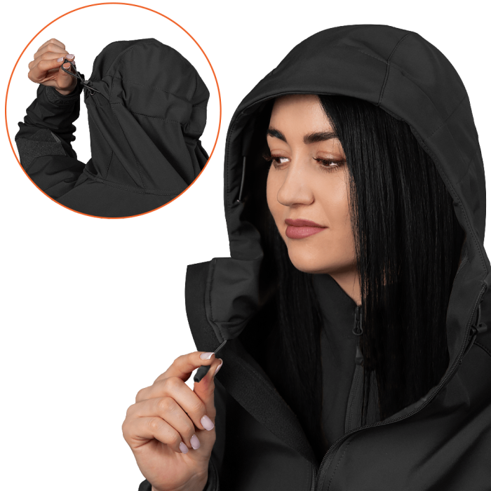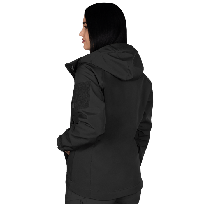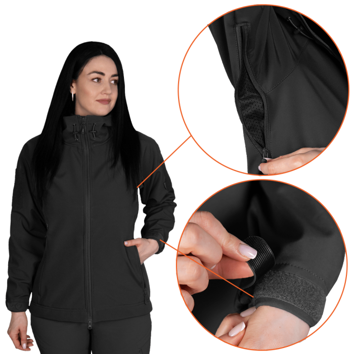 Куртка вироблена з оригінальної тканини SoftShell. Це легка, сучасна тканина зі справжньою безпоровою мембраною, яка складається з трьох шарів: мікрофліс який зберігає тепло; мембрана що захищає від вітру та вологи; еластичний поліестер із вологостійким просоченням, який захищає від пилу, бруду й вологи. Куртка легка, дихаюча, має ергономічний крій з урахуванням анатомії людини. Трохи ширша знизу, спеціально адаптована під жіночу фігуру. Куртка має дві внутрішні кишені та дві зовнішні кишені спереду. Всі зовнішні кишені на застібці-блискавці, а також з вентиляційною сіткою Cool Mesh. Додатково під пахвами присутні вентиляційні клапани с сіткою Cool Mesh, на застібці-блискавці. Об’єм та посадка по низу куртки регулюється утяжками з пластиковими фіксаторами. Також по низу куртки присутня резинка з утяжками для регулювання об'єму та фіксації. На рукавах присутні липучки під патчі або шеврони, манжети регулюються та фіксуються липучками. Каптур ергономічний, не сковує рухів, не заважає огляду, оснащений захисним піддашком, регулюється утяжками з пластиковими фіксаторами. Куртка добре підходить як формений одяг для воєнізованих та охоронних структур. Матеріал: SoftShell Склад: 100% Поліестер Паропроникність: 3000 мм/м²/24 год Вологостійкість(WPR): 8000 г/м²/24 год Фурнітура: Woojin Температурний режим: від +15°C до -15°C(при пошаровому одяганні)