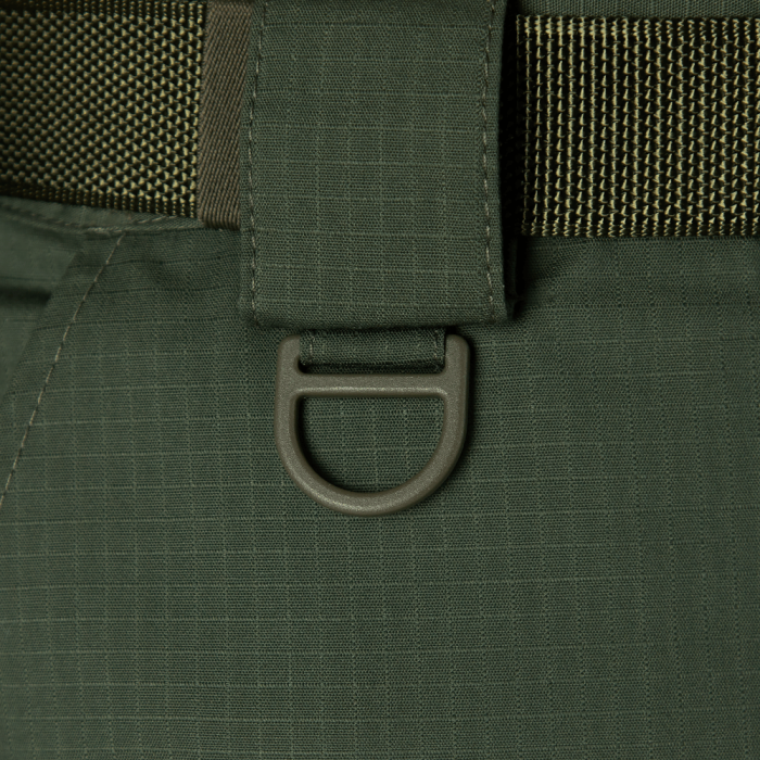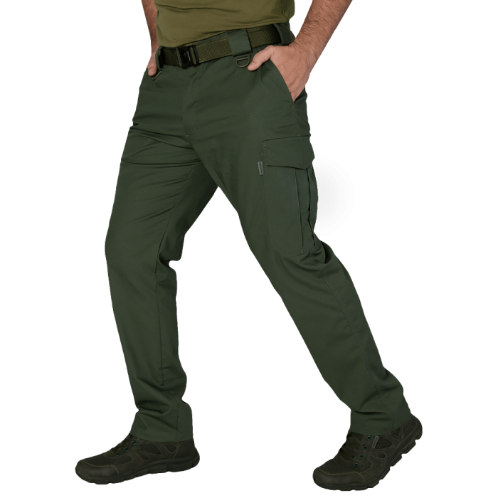 Штани мають: дві основні, врізні кишені спереду; дві накладні кишені типу карго на стегнах; дві врізні кишені ззаду, з клапаном на застібках-липучках. Прорізний клапан на застібці-блискавці.