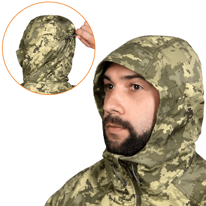 Куртка з каптуром має дві містких кишені спереду і дві кишені на рукавах, під липучками для патчів або шевронів. Усі застібки-блискавки мають пулери для роботи з ними в рукавичках. Комір завищений та має захист від защеплення підборіддя. По низу куртки є спеціальні утяжки з пластиковими фіксаторами для регулювання фіксації. Об’єм рукавів регулюється і фіксується липучками.