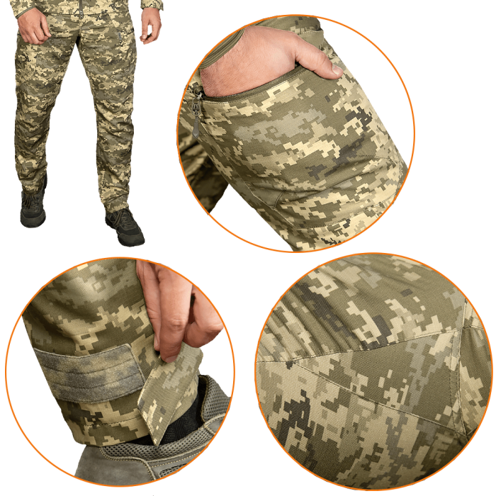 Штани з завищеним поясом та конструктивними виточками в зоні колін і сідла, для більшої рухливості та зносостійкості виробу. Мають дві кишені спереду, та дві місткі, врізні кишені по боках. Фіксуються на застібку-блискавку, а знизу на липучки.