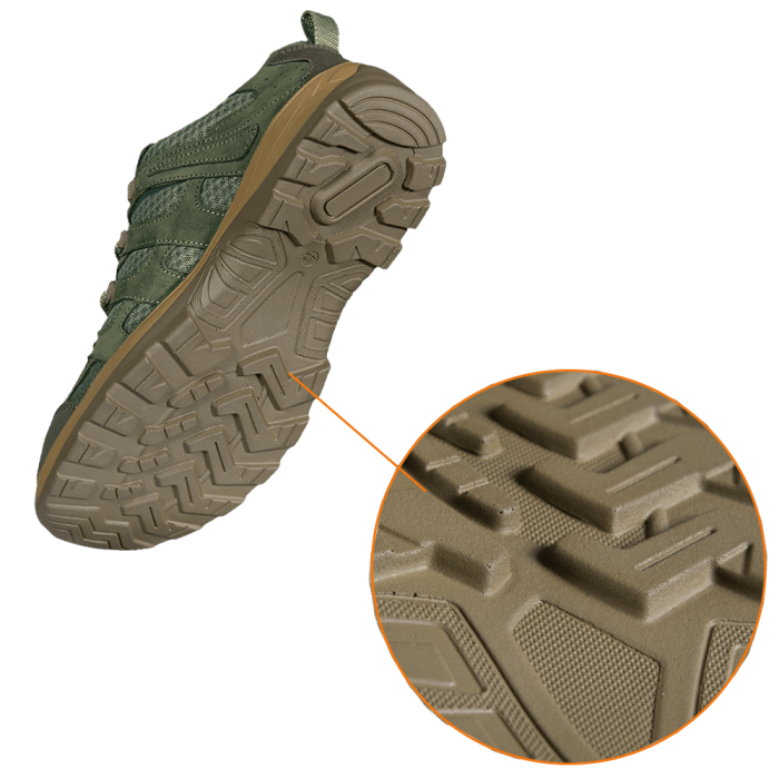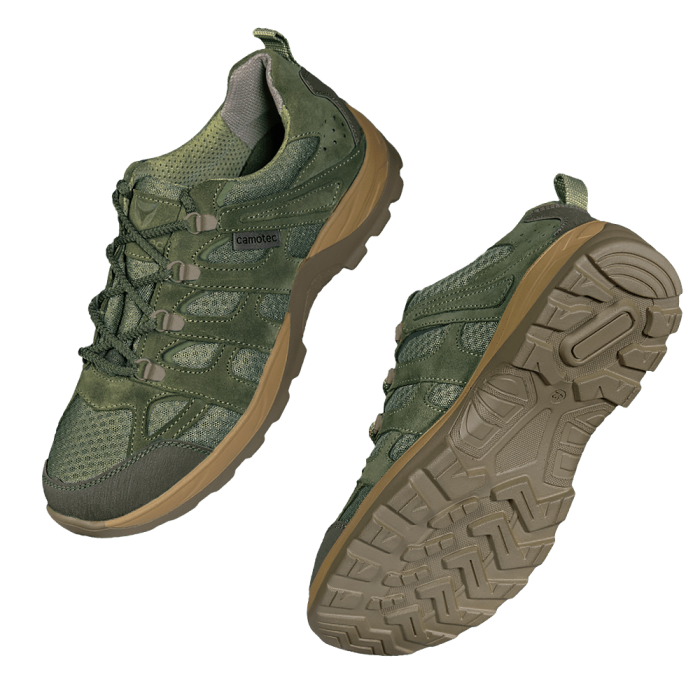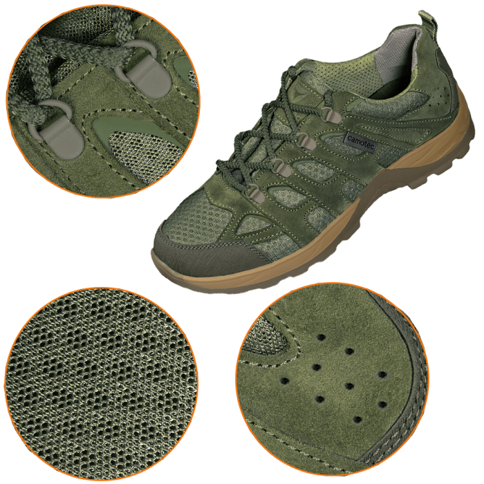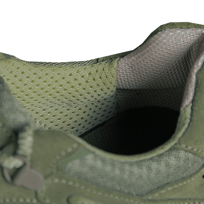Універсальні кросівки для міста, які підійдуть як повсякденне взуття, або навіть як формене взуття для охоронних та воєнізованих структур, в теплу пору року. Кросівки виготовлені з нубуку — це високоякісна дрібноворсиста натуральна шкіра, оброблена методом шліфування. При такому методі обробки поверхневий шар шкіри знімають, і вона стає більш гігроскопічною. Оброблена таким чином шкіра виходить більш податливою та зносостійкою.  Також в кросівках є ще вставки зі зносостійкого сітчастого матеріалу, який покращує вентиляцію та циркуляцію повітря в середині. Підошва вироблена з термопластику, це легкий, пружній та зносостійкий матеріал з витриманим балансом жорсткості й м'якості. Кріпиться до основи вакуумно-клейовим методом. Устілка виконана із матеріалу EVA, легка, має низький рівень теплопровідності, стійка до розкладання та гниття, забезпечує надійний захист від грибкових захворювань та розповсюдження бактерій. Кросівки вироблені в сучасному, спортивному стилі, та мають продуманий, ергономічний дизайн. Мають низьку посадку, щільно прилягають до стопи, не перешкоджаючи руху крові. Носок додатково захищений накладкою з щільного, зносостійкого матеріалу. Люверси вироблені з металу, що запобігає їх перетиранню. Матеріал основи: 100% шкіра Матеріал вставок: 100% поліестер Матеріал підошви: ТЕП Температурний режим: Від +15°C до +25°C