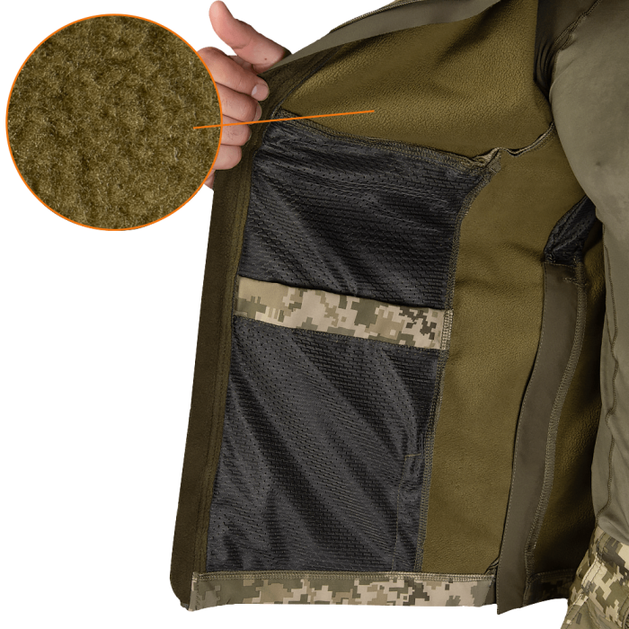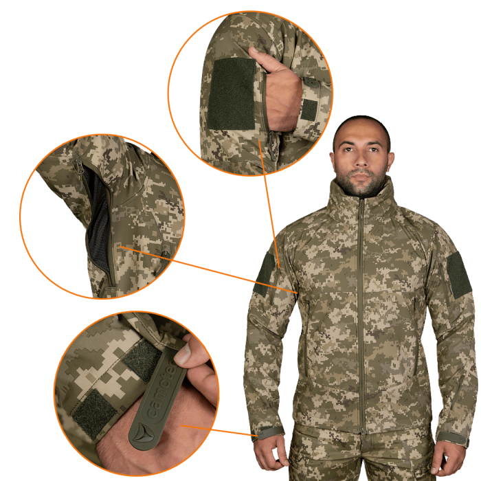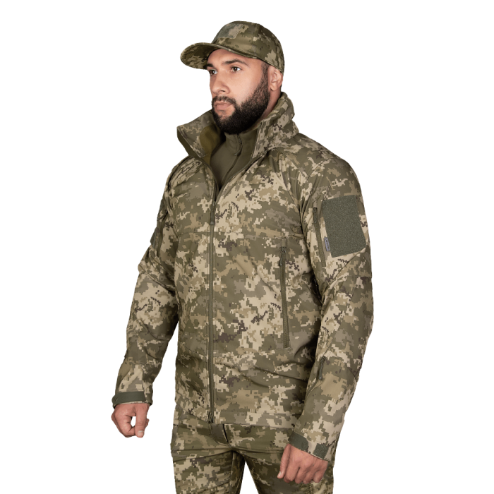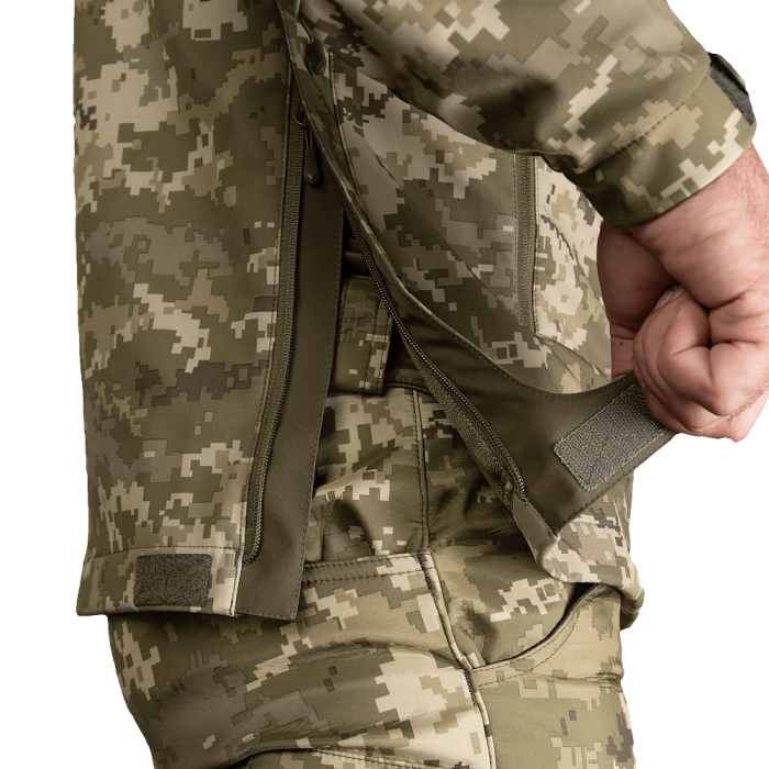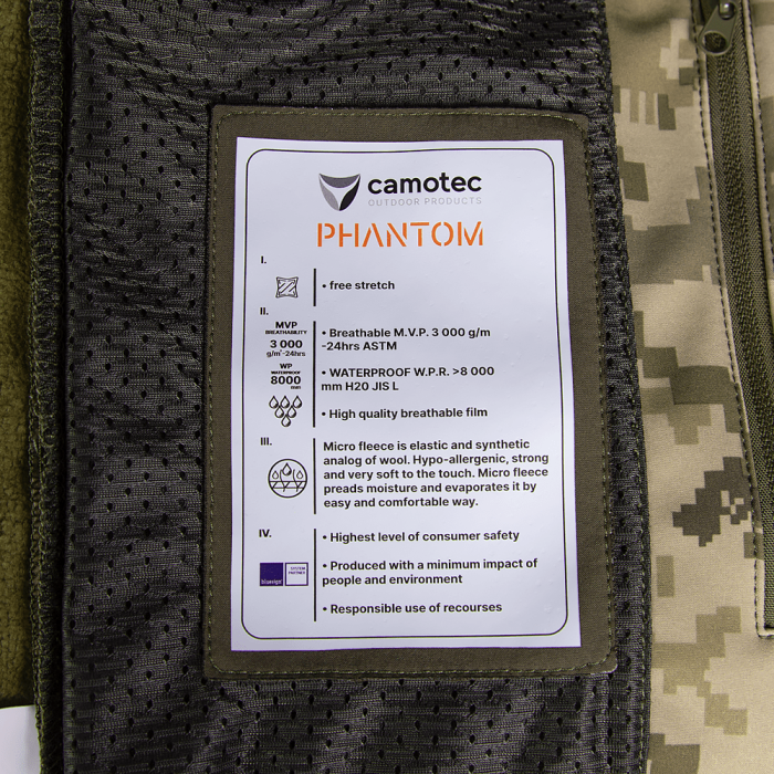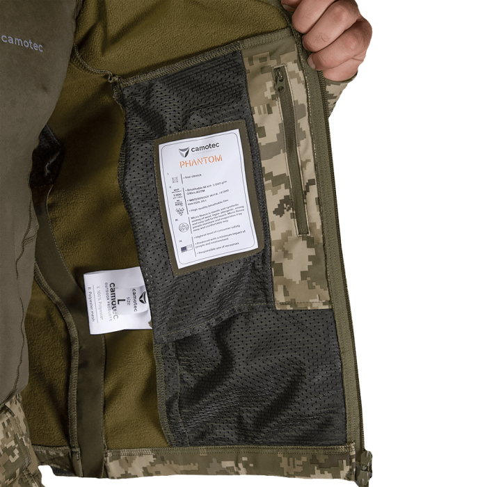 Тактична куртка Phantom System розроблена нашими фахівцями для справжніх професіоналів. Має ряд конструктивних особливостей, які роблять її ідеальним вибором, як форменого одягу для військових підрозділів. Куртка вироблена з оригінальної тканини SoftShell зі справжньою мембраною. Головною перевагою цього матеріалу є ідеальне утримання балансу між захистом від холоду, вологи й хорошою циркуляцією повітря. SoftShell складається з трьох шарів: Зовнішній шар - еластичний поліестер з водовідштовхувальним просоченням, який надійно захищає Вас від вологи пилу та бруду. Середній шар -  мембрана плівка, яка тримає вологу, повністю захищає від вітру, є стійкою до морозу та пропускає повітря зсередини. Внутрішній шар - мікрофліс, це м’який, еластичний,  приємний на дотик утеплюючий матеріал. Куртка вироблена з урахуванням анатомії людини. Тому вона гарантує Вам комфорт та свободу рухів при тривалому використанні у складних умовах (погана погода, польові умови). Каптур куртки регулюється по глибині та об’єму, має захисний піддашок. Складається в комір та фіксується на липучки. До того ж сам комір - завищений. Система складання каптура в комір розроблена таким чином, щоб не дозволити потрапити волозі всередину (як у складеному, так і у розкладеному стані), як буває у більшості подібних моделей. Однією з особливостей нашої куртки є спеціальні вирізи по боках - для Вашого швидкого доступу до зони поясу. Зазвичай на поясі кріпиться кобура зі зброєю або пояс із додатковим спорядженням, а ці вирізи надають Вам швидкий доступ до цієї зони (відкриття займає кілька секунд одним рухом). Самі вирізи застібаються застібкою-блискавкою і фіксуються липучкою.  На рукавах присутні липучки під патчі та шеврони. Які дозволять вам персоналізувати куртку. Загально, куртка має сім кишень, включаючи внутрішні та зовнішні. Це надає вам багато місця для зберігання необхідних предметів. Загальна блискавка куртки має два бігунки, що дозволяє вам регулювати вентиляцію та доступ до внутрішнього спорядження. Під пахвами куртки розміщені спеціальні вентиляційні отвори з сіткою Cool Mesh, які можна регулювати застібкою-блискавкою, забезпечуючи оптимальну циркуляцію повітря. Тканина: SoftShell (100% поліестер) Паропроникність: 3000 г/м² Вологостійкість: 8000 мм/см² Рекомендований температурний режим: від +15°C до -15°C