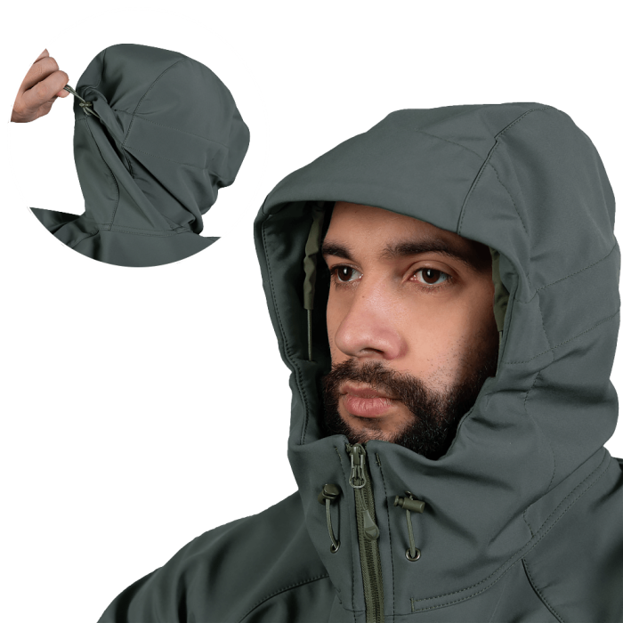 Куртка має ергономічний каптур який не заважає огляду та оснащений захисним піддашком. Регулюється утяжками з пластиковими фіксаторами.
