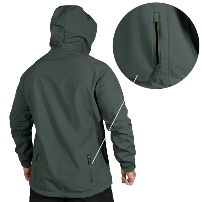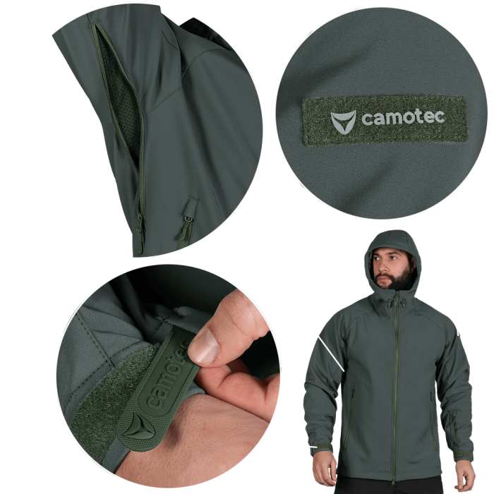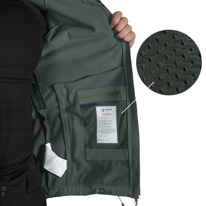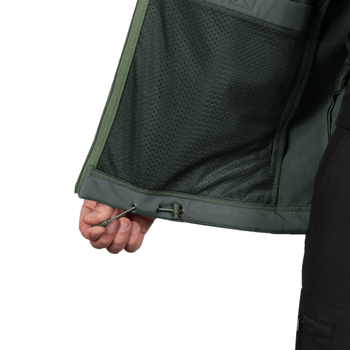 Куртка вироблена з оригінальної тканини SoftShell. Це легка, сучасна тканина зі справжньою безпоровою мембраною, яка складається з трьох шарів: мікрофліс який зберігає тепло; мембрана що захищає від вітру та вологи; еластичний поліестер із вологостійким просоченням, який захищає від пилу, бруду й вологи.