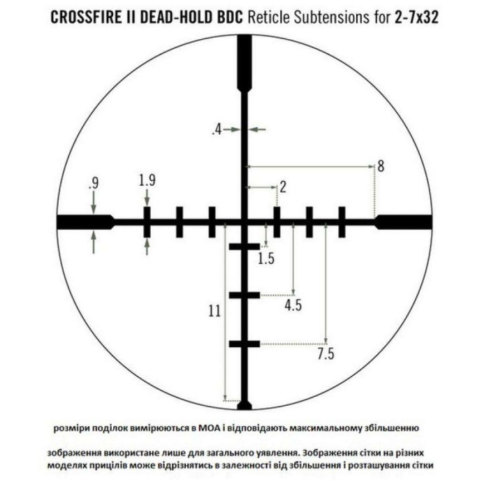 Маючи в своєму розпорядженні збільшену фокусну відстань вихідної зіниці, механізм швидкого фокусування Fast Focus, повне багатошарове просвітлення оптики і обнуляючі барабани введення поправок, даний приціл сконструйований без компромісів і за своїми характеристиками залишає далеко позаду більшість аналогічних моделей в своїй ціновій категорії. Міцний монолітний корпус з авіаційного алюмінію з анодованим покриттям захищений від подряпин, вологи, пилу і запотівання. Універсальна прицільна сітка Dead-Hold BDC дозволяє швидко визначити траєкторію падіння кулі на різних дистанціях і вжити необхідних поправок по вертикалі і горизонталі. Приціл Vortex Crossfire II 2-7x32 (BDC) рекомендований для полювання і спортивної стрільби на близькі і середні дистанції з потужної пневматичної, а також нарізної зброї під патрони центрального бою і кільцевого запалення калібру до .308 WIN включно.