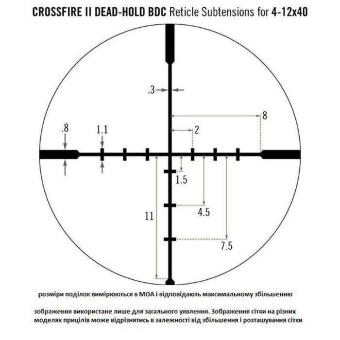 Маючи в своєму розпорядженні збільшену фокусну відстань вихідної зіниці, механізм швидкого фокусування Fast Focus, механізм відбудови паралакса на об'єктиві, повне багатошарове просвітлення оптики і обнуляючі барабани введення поправок, даний приціл сконструйований без компромісів і за своїми характеристиками залишає далеко позаду більшість аналогічних моделей в своїй ціновій категорії. Міцний монолітний корпус з авіаційного алюмінію з анодованим покриттям захищений від подряпин, вологи, пилу і запотівання. Універсальна прицільна сітка Dead-Hold BDC дозволяє швидко визначити траєкторію падіння кулі на різних дистанціях і ухвалити необхідні поправки по вертикалі і горизонталі. Додатково комплектація розширена сонцезахисною блендою. Приціл Vortex Crossfire II 4-12x40 AO (BDC) рекомендований для полювання і спортивної стрільби на середні та дальні дистанції з потужної пневматичної, а також нарізної зброї під патрони центрального бою і кільцевого запалення калібру до .308 WIN включно.