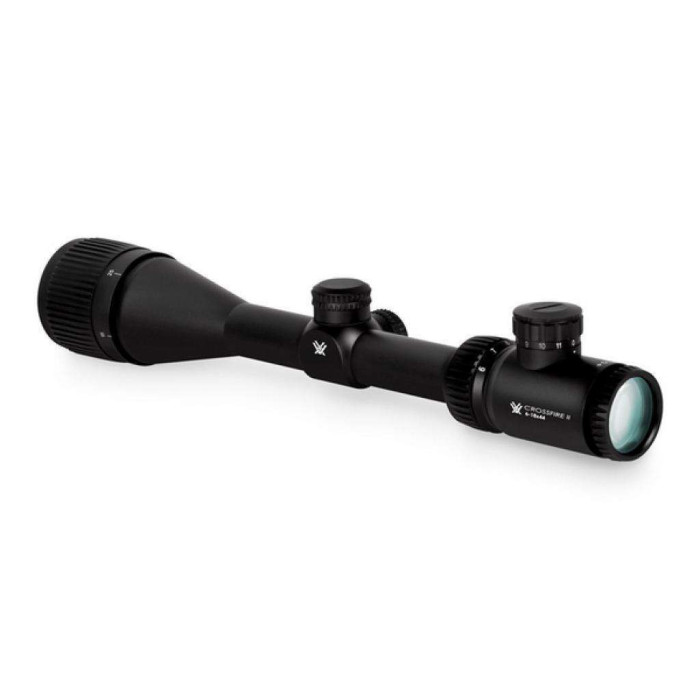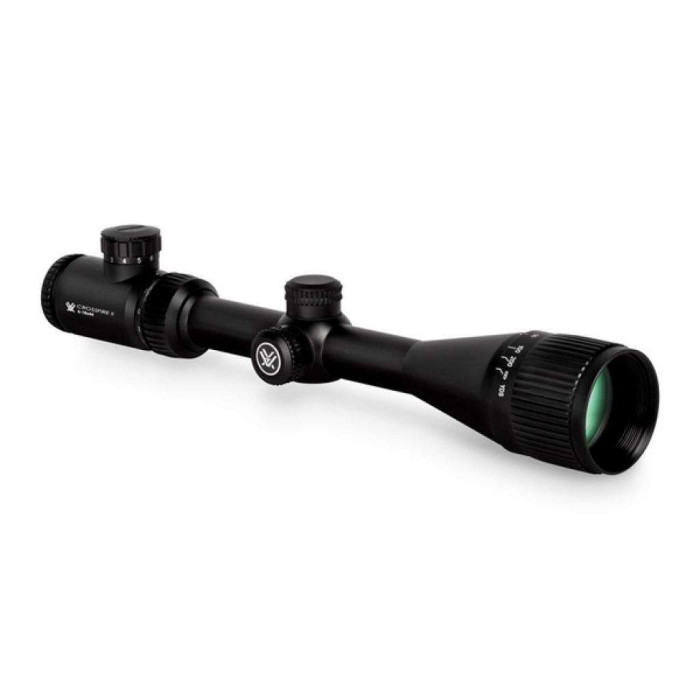 Маючи в своєму розпорядженні збільшену фокусну відстань вихідної зіниці, механізм швидкого фокусування Fast Focus, механізм відбудови паралакса на об'єктиві, повне багатошарове просвітлення оптики, даний приціл сконструйований без компромісів і за своїми характеристиками залишає далеко позаду більшість аналогічних моделей в своїй ціновій категорії. Міцний монолітний корпус з авіаційного алюмінію з анодованим покриттям захищений від подряпин, вологи, пилу і запотівання. Центральна точка сітки має підсвічування з 11-ма рівнями яскравості для стрільби в умовах зниженої видимості. Додатково комплектація розширена сонцезахисною блендою. Приціл Vortex Crossfire II 6-18x44 AO (V-Brite IR) рекомендований для мисливців - стрільців на середні дистанції з нарізної зброї патронами центрального бою і кільцевого запалення калібру до .308 WIN включно.