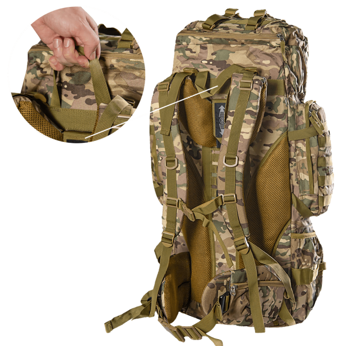 Жорстка конструкція з алюмінієвою каркасною трубкою забезпечує стійкість і підтримку під час перенесення важкого спорядження. Ергономічна спинка рюкзака має м'які амортизуючі вставки, які рівномірно розподіляють вагу, зменшуючи навантаження на спину. Завдяки вентиляційній сітці, спина залишається сухою навіть під час інтенсивних переходів.