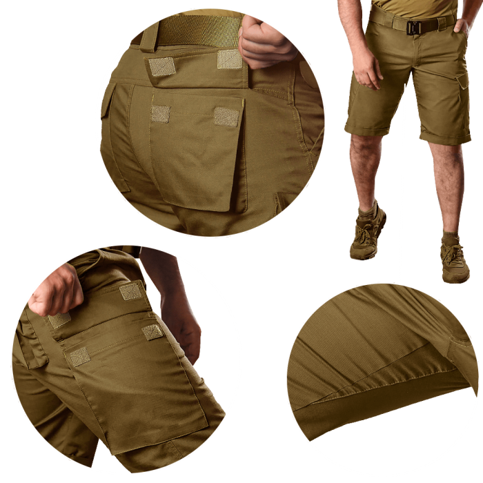 Шорти мають шість кишень: дві ззаду на липучках, дві класичні спереду, і дві типу карго на стегнах, теж на липучках.