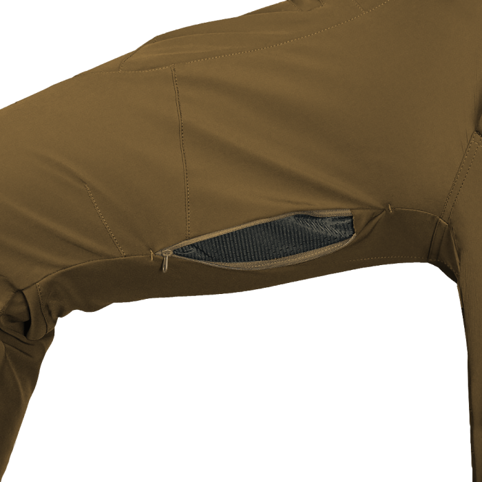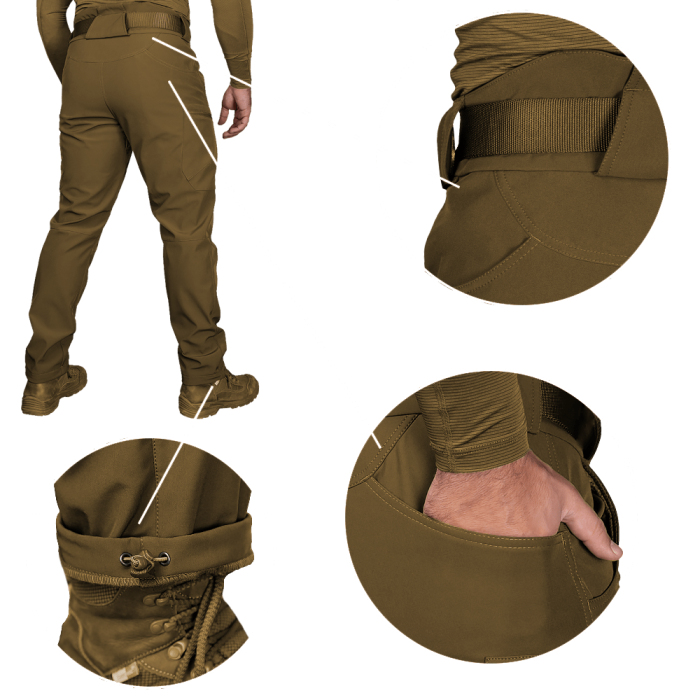 Штани вироблені з оригінальної тканини SoftShell. Це легка, сучасна тканина зі справжньою безпоровою мембраною, яка складається з трьох шарів: мікрофліс який зберігає тепло; мембрана що захищає від вітру та вологи; еластичний поліестер із вологостійким просоченням, який захищає від пилу, бруду й вологи.