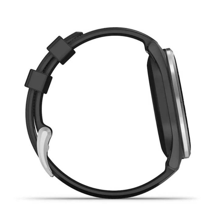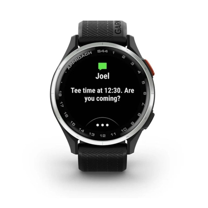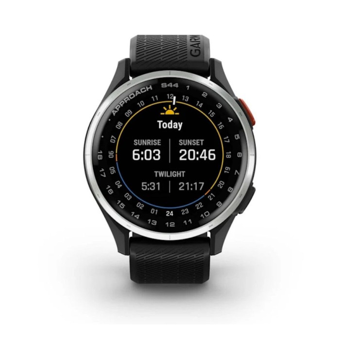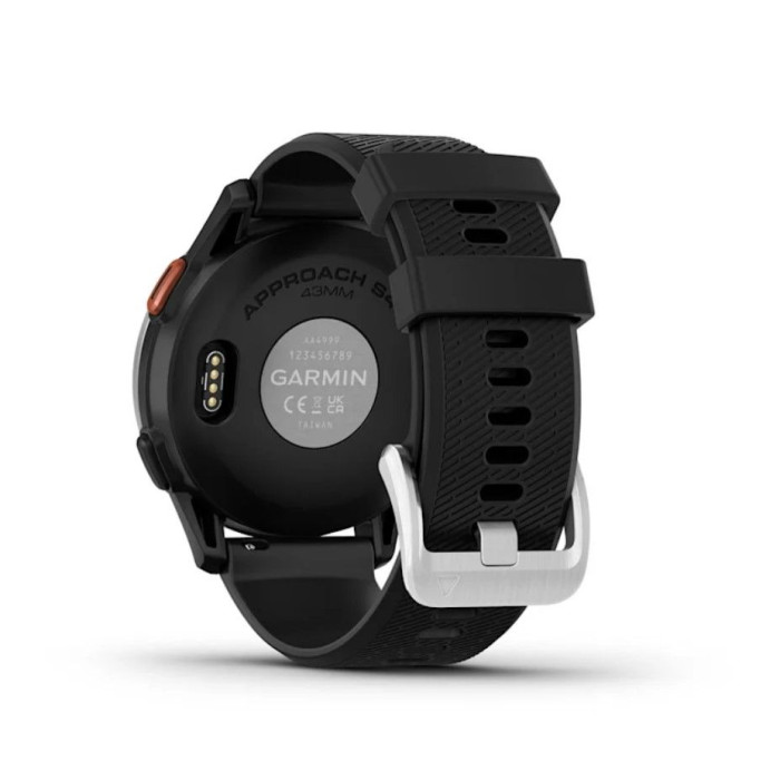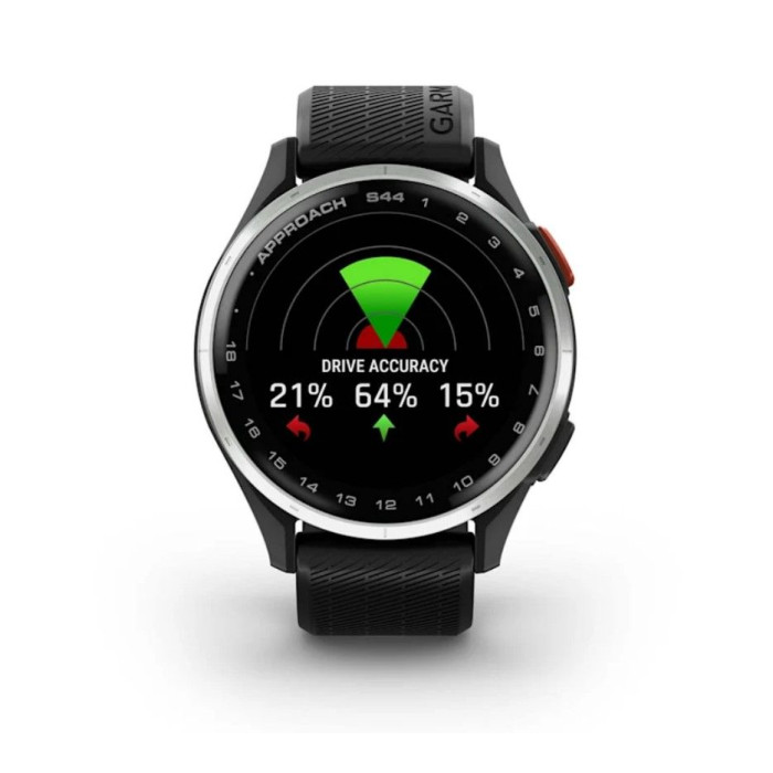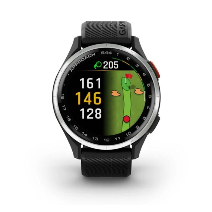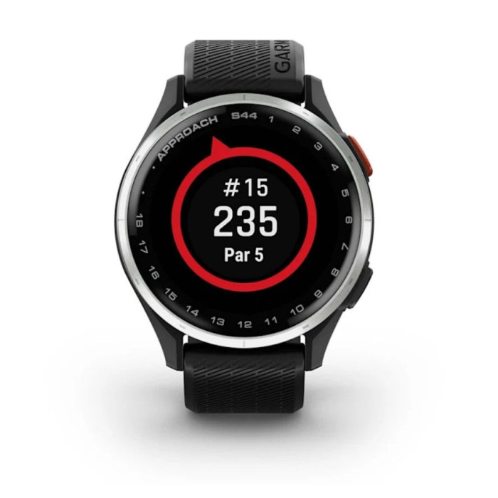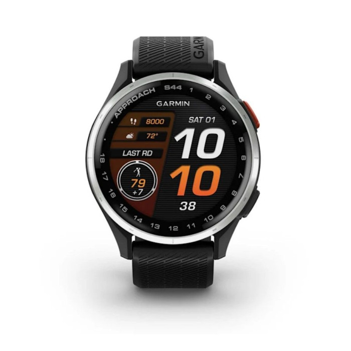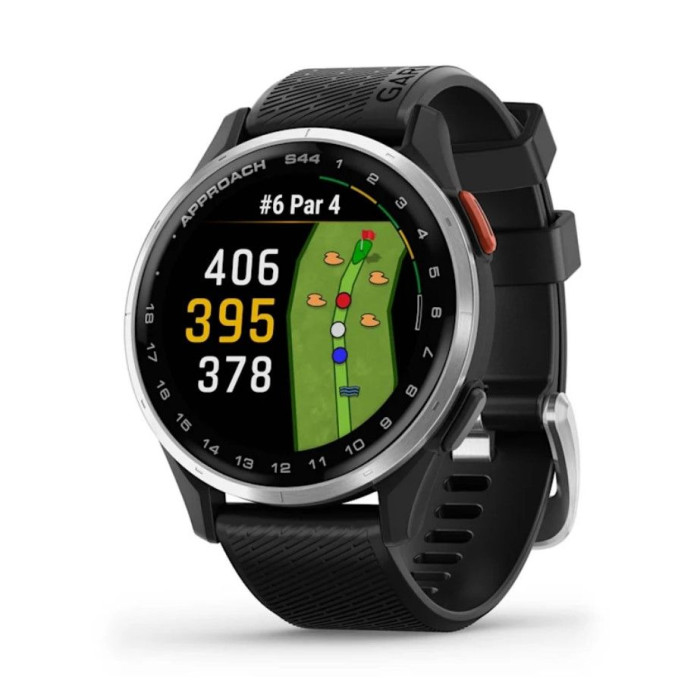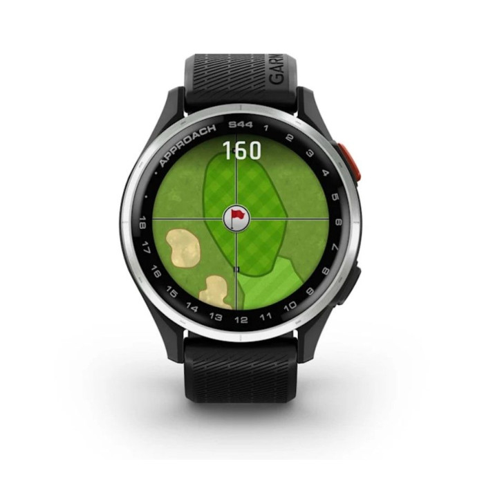 Смарт-годинник Garmin Approach S44 зі сріблястим алюмінієвим безелем і чорним силіконовим ремінцем
