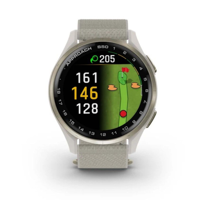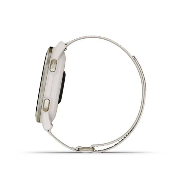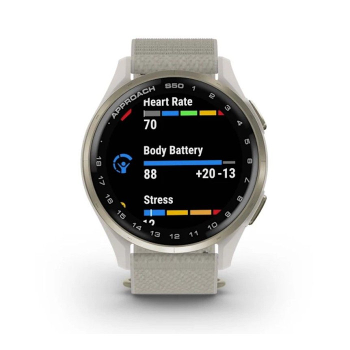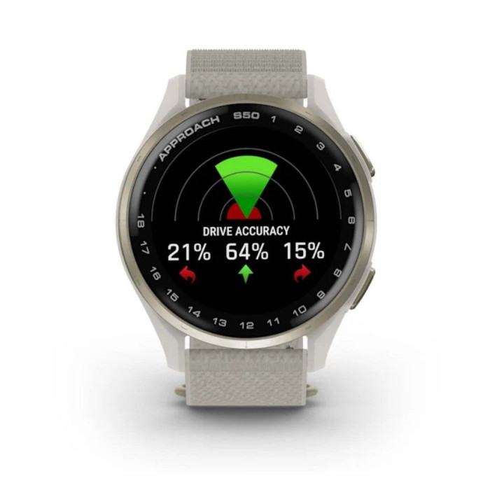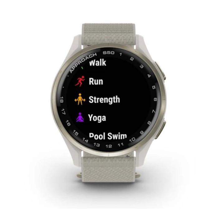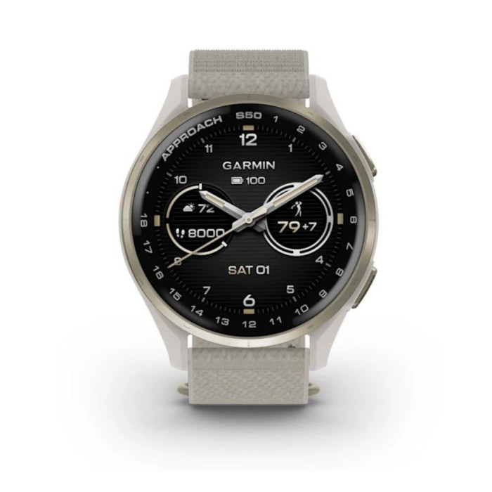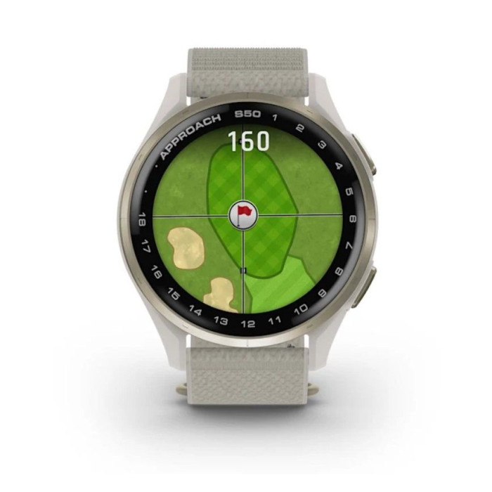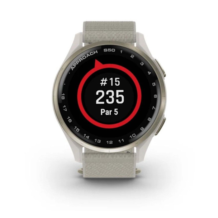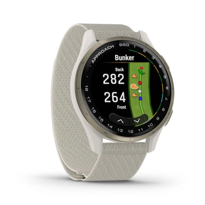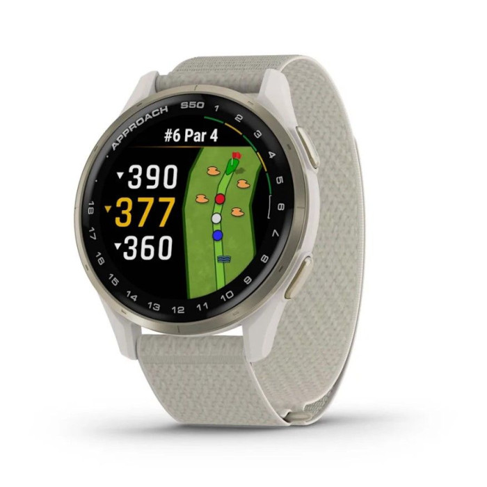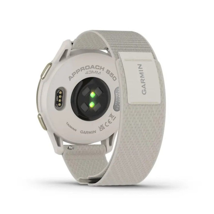 Смарт-годинник Garmin Approach S50 з алюмінієвим безелем кольору кремового золота з нейлоновим ремінцем ComfortFit кольору слонової кістки