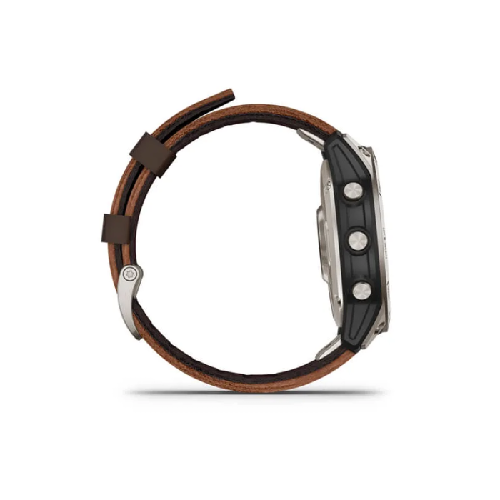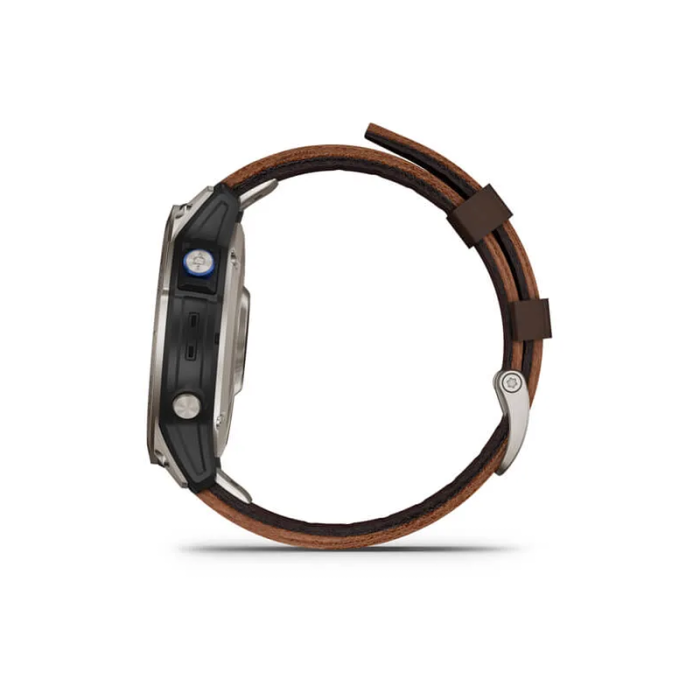 сапфіровий дисплей, титановий безель і коричневий шкіряний ремінець або