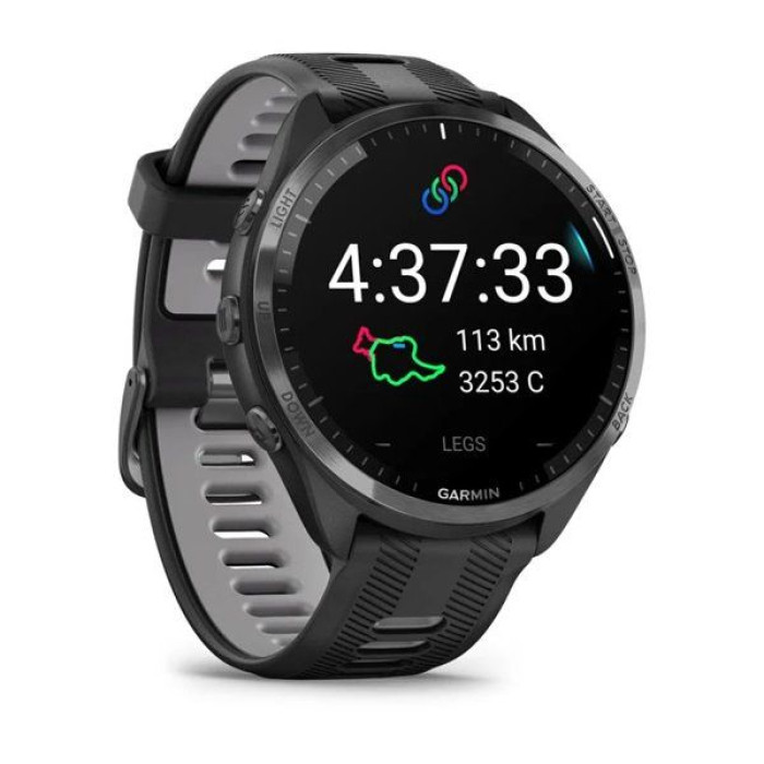 Смарт-годинник Garmin Forerunner 965 з карбоново-сірим титановим безелем, чорним корпусом та чорно-сірим силіконовим ремінцем