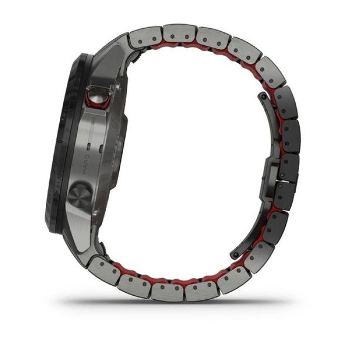 Цей сучасний годинник-інструмент, створений для найсильніших суперників, оснащений приголомшливим сенсорним дисплеєм AMOLED з традиційними кнопками керування. Корпус діаметром 46 мм виготовлений з титана Grade 5 з гібридним титановим браслетом з червоними силіконовими ланками і застібкою-метеликом, що надає годиннику спортивний дизайн.