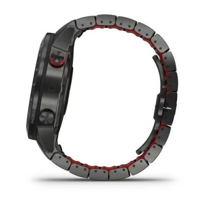 Гібридний титановий браслет з червоними силіконовими ланками (кільцями) забезпечує комфорт та відчуття прохолоди, а міцне DLC-покриття гарантує витривалість годинника в умовах гонки.