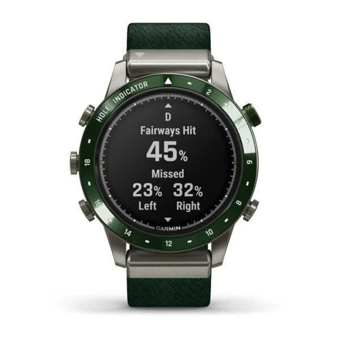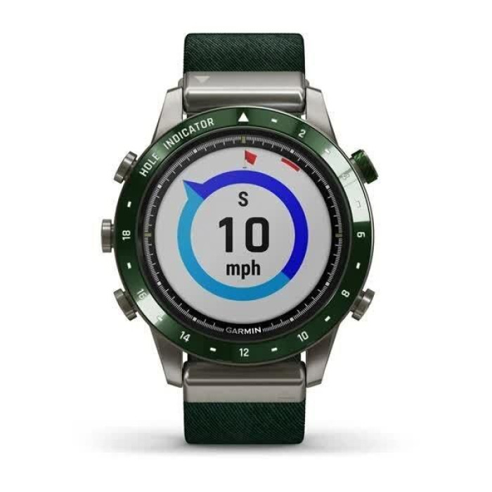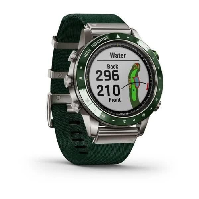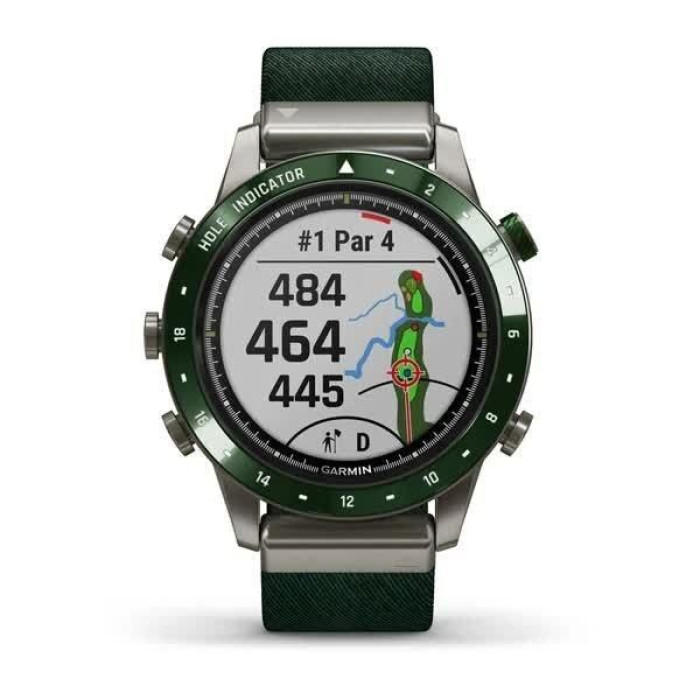 Цей розкішний годинник з опуклим сапфіровим склом, постійно увімкненим дисплеєм та 18 помітками у вигляді лунок на кільці навколо циферблату наочно демонструє вашу прихильність до гольфу.