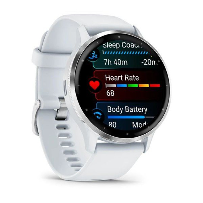 Смарт-годинник Garmin Venu 3, сріблястий сталевий безель з корпусом кольору білого каменя та силіконовим ремінцем