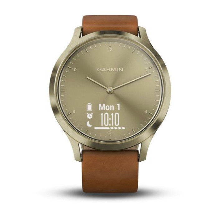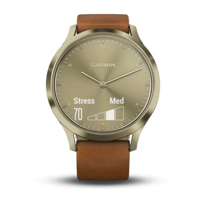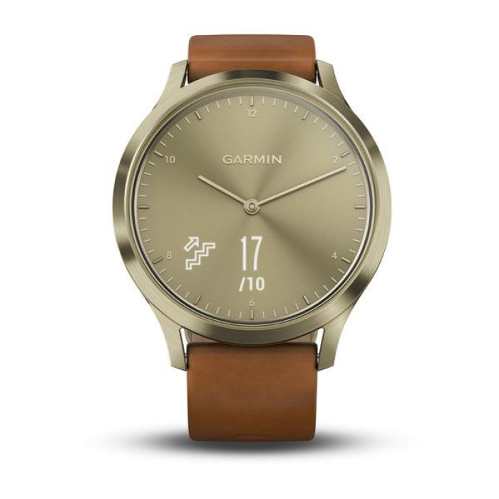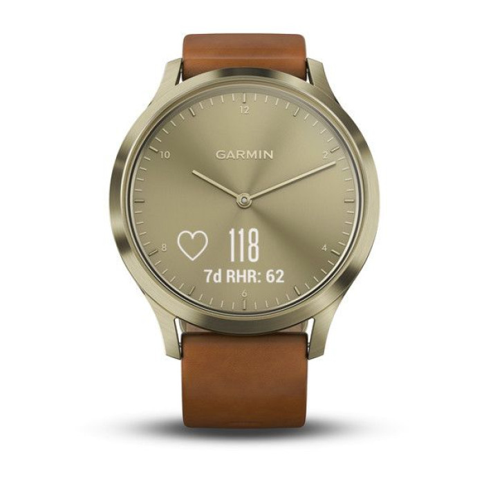 • Модель vivomove HR Premium зі світло-коричневим шкіряним ремінцем, золотистим сталевим безелем та золотистими стрілками. Розмір: Small/Medium.